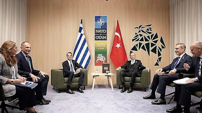 Συνάντηση Δένδια - Γκιουλέρ: Σημειώνεται ότι και ο υπουργός Εθνικής Άμυνας Νίκος Δένδιας είχε συνάντηση με τον Τούρκο ομόλογό του Γιασάρ Γκιουλέρ, στο περιθώριο της Συνόδου Κορυφής του ΝΑΤΟ. Η συνάντηση έγινε σε καλό κλίμα και σύμφωνα με τον υπουργό Άμυνας, υπογραμμίστηκε «η σημασία θετικού κλίματος, διαύλων επικοινωνίας και συναντήσεων για τις διμερείς μας σχέσεις και τη συνεργασία μας βάσει Διεθνούς Δικαίου και Αρχής καλής γειτονίας». Επίσης «συμφωνήθηκε η επικοινωνία δύο πλευρών για την διευθέτηση Συνάντησης για δραστηριότητες Μέτρων Οικοδόμησης Εμπιστοσύνης (ΜΟΕ)». naftemporiki.gr
